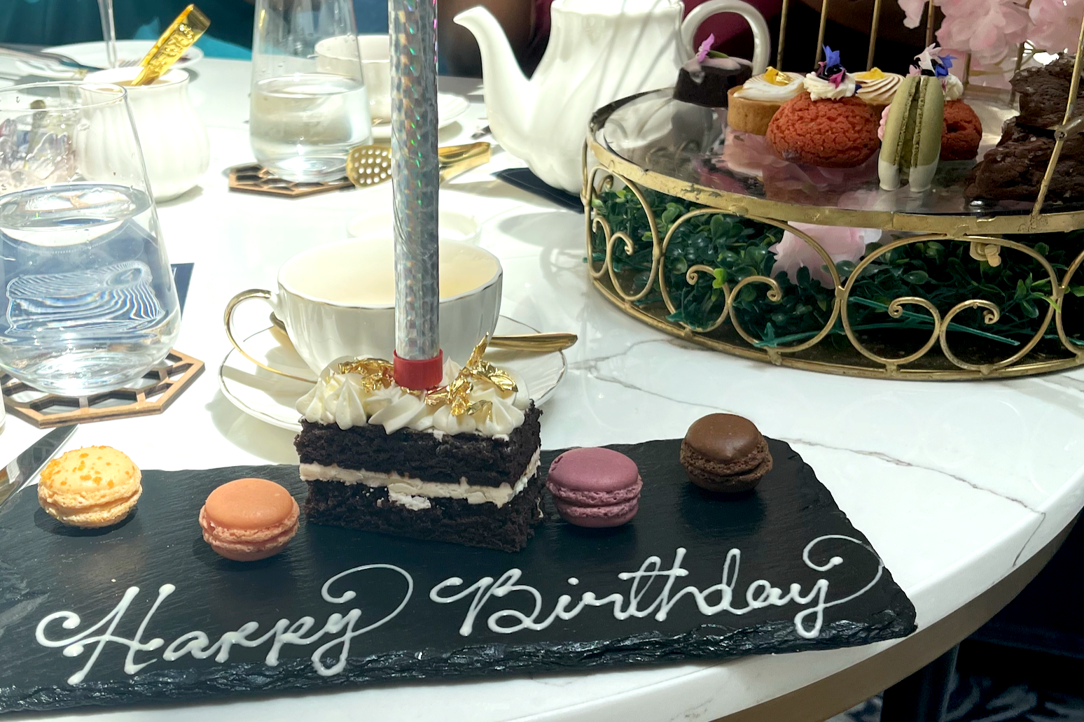 Desserts included a pistachio macaron, mango meringue tart, cherry cream puff, chocolate cherry financier, and a strawberry sakura shortbread. But the real standout were the scones! They were massive, perfectly crispy on the outside, and gooey on the inside. The lemon poppy seed scone was my favorite, but surprisingly, the chocolate cherry one blew me away. It tasted like a fudge brownie and I’m not even a big chocolate person, but I loved it. We were celebrating a birthday (mine!) and the waiter surprised me with a slice of chocolate cake with cream cheese frosting and a sparkler on top! It also came with four macarons. I had noted online when making the reservation that we were celebrating a birthday, but I’m sure this is something you could mention on the spot and they would accommodate as well. It was a lovely, thoughtful touch and it was a big slice of cake! And again, I am not a big chocolate person but I really enjoyed the cake!