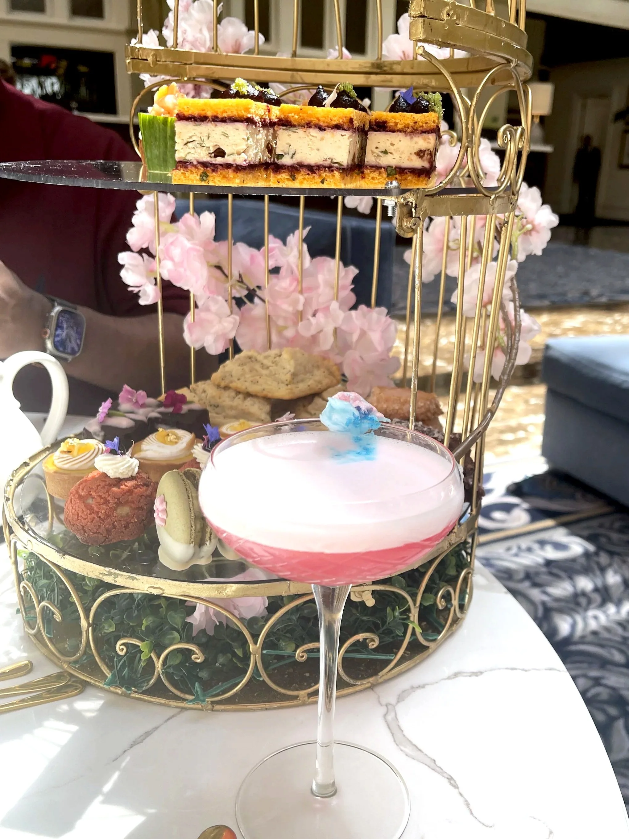 The tea service takes place around a faux cherry blossom tree that, while artificial, looks completely real and occupies the central space. It’s the first thing you are going to notice when you walk in. The food and tea were served in golden bird cages, adorned with cherry blossoms, holding the traditional three-tiered tray. There were 10 tea options, plus a seasonal cocktail: the “Cherry Cotton Candy Kiss.” At $25, it was steep for a cokctail, but my family and I were celebrating, so we went for it. It was made of Grey Goose, cranberry juice, and cotton candy cherry, topped with literal cotton candy. It was a fun, whimsical, pricey add-on. I’m not a big drinker, but I really enjoyed it.