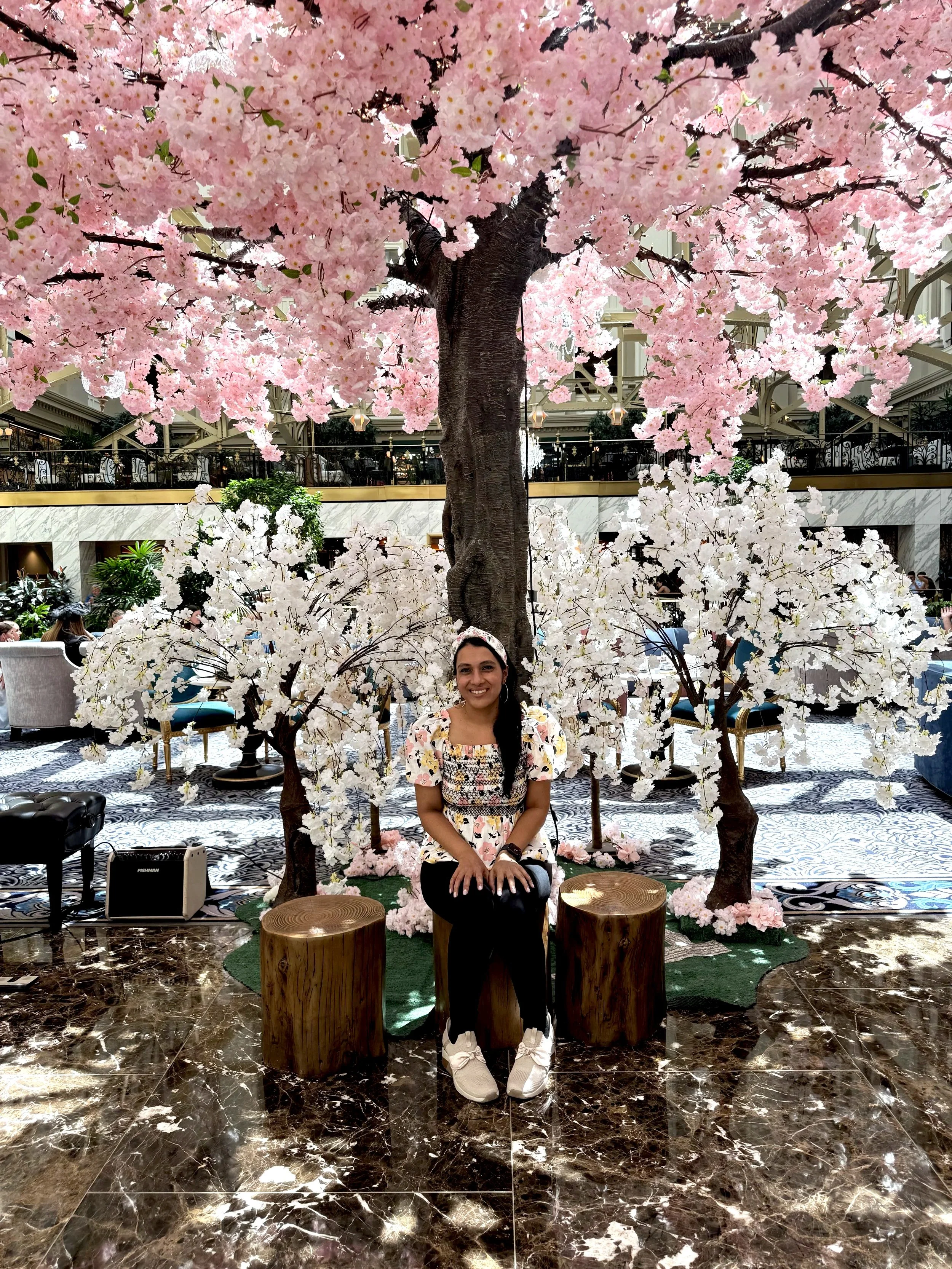 The Experience: My experience at the Waldorf Astoria’s Cherry Blossom Afternoon Tea was BEAUTIFUL and undeniably BOUGIE, my favorite combination. From the moment I stepped into the space, I knew this was going to be a classy affair. You enter a beautiful atrium where a harpist was playing instrumental versions of both classic and modern songs. It reminded me of the soundtrack from the show Bridgerton. There was no tip jar though, and I would have gladly tipped. The venue had high glass ceilings that let in tons of natural light, stunning, though occasionally the sun did get in our eyes a bit. Still, it was beautiful.